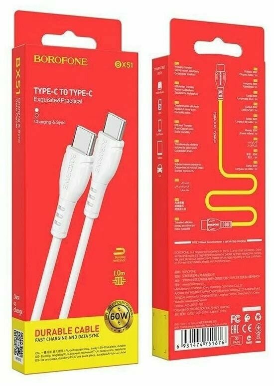 Кабель Borofone USB- Type-C (BX51), 1 м, 1 шт., белый