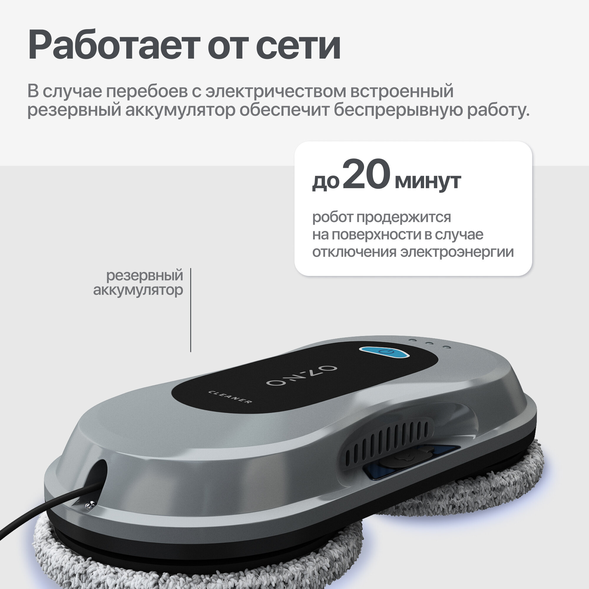 | Комплектация | адаптер питания / аккумулятор / моющая тряпка / пульт ДУ / страховочный шнур |