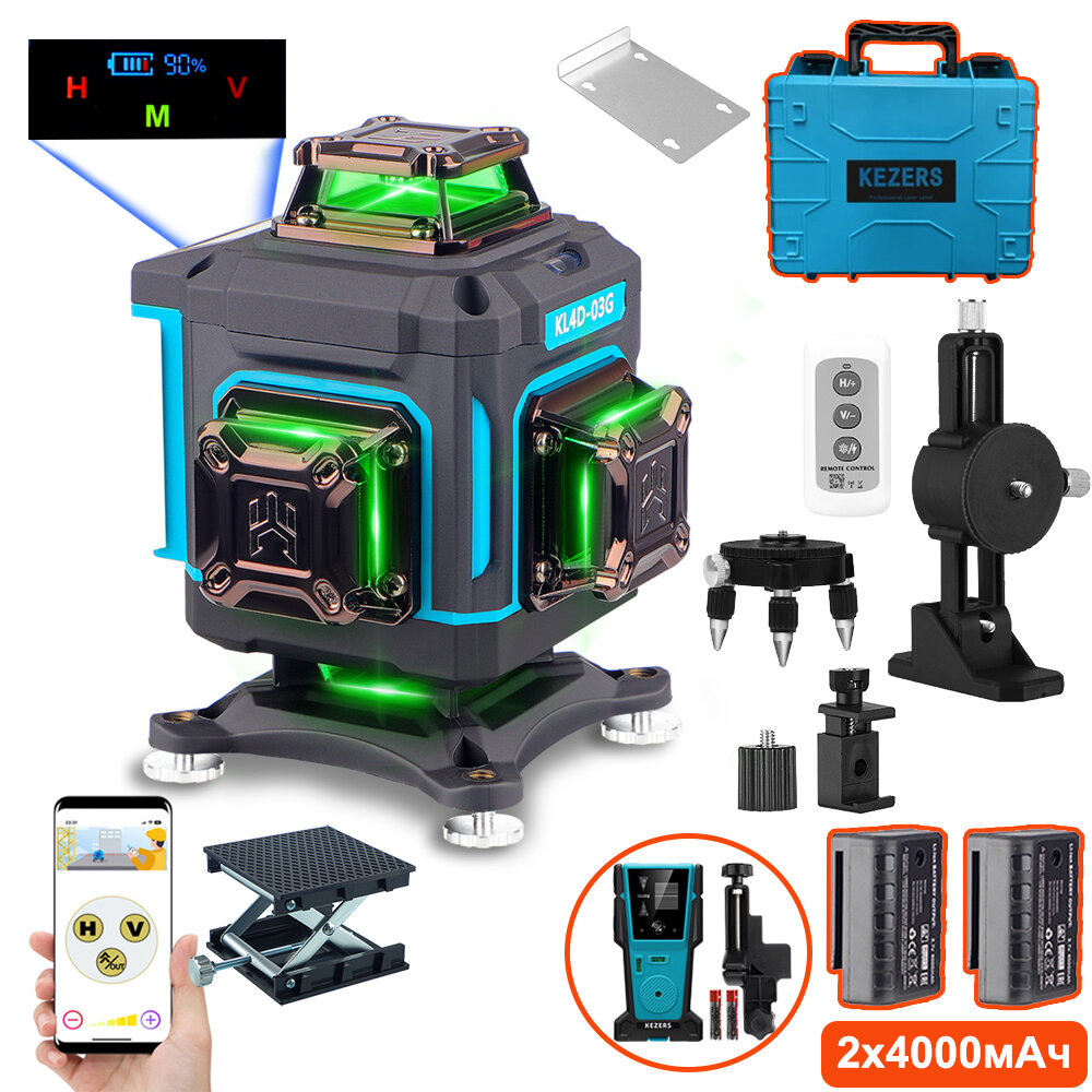 СохранитьЛазерный уровень Kezers KL4D-03G, Зеленый луч 360 4D 16 Линий, С 2-мя литиевыми батареями емкостью 4000 мАч Чемодан, С приемником KL-1D интересное: