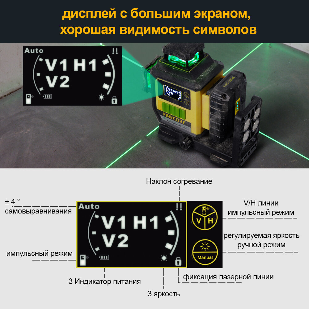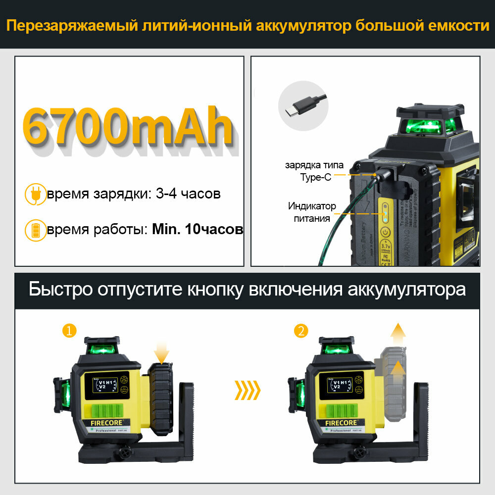 Лазерный уровень Firecore F95T-3G , 3D ,12 лучей , Дисплей, Аккумулятор 3.7V 6700 мАч , в кейсе