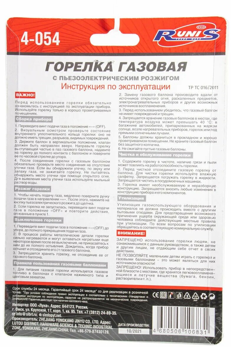Газовая горелка Runis 4-054 с пьезоэлементом, 17х5.5х4 см
