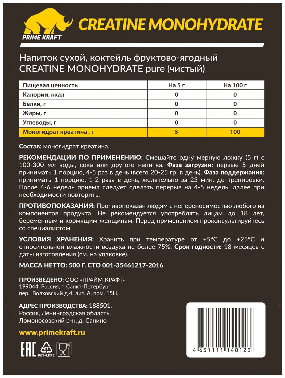 Креатин Prime Kraft Creatine Monohydrate 100% (чистый), 500 гр