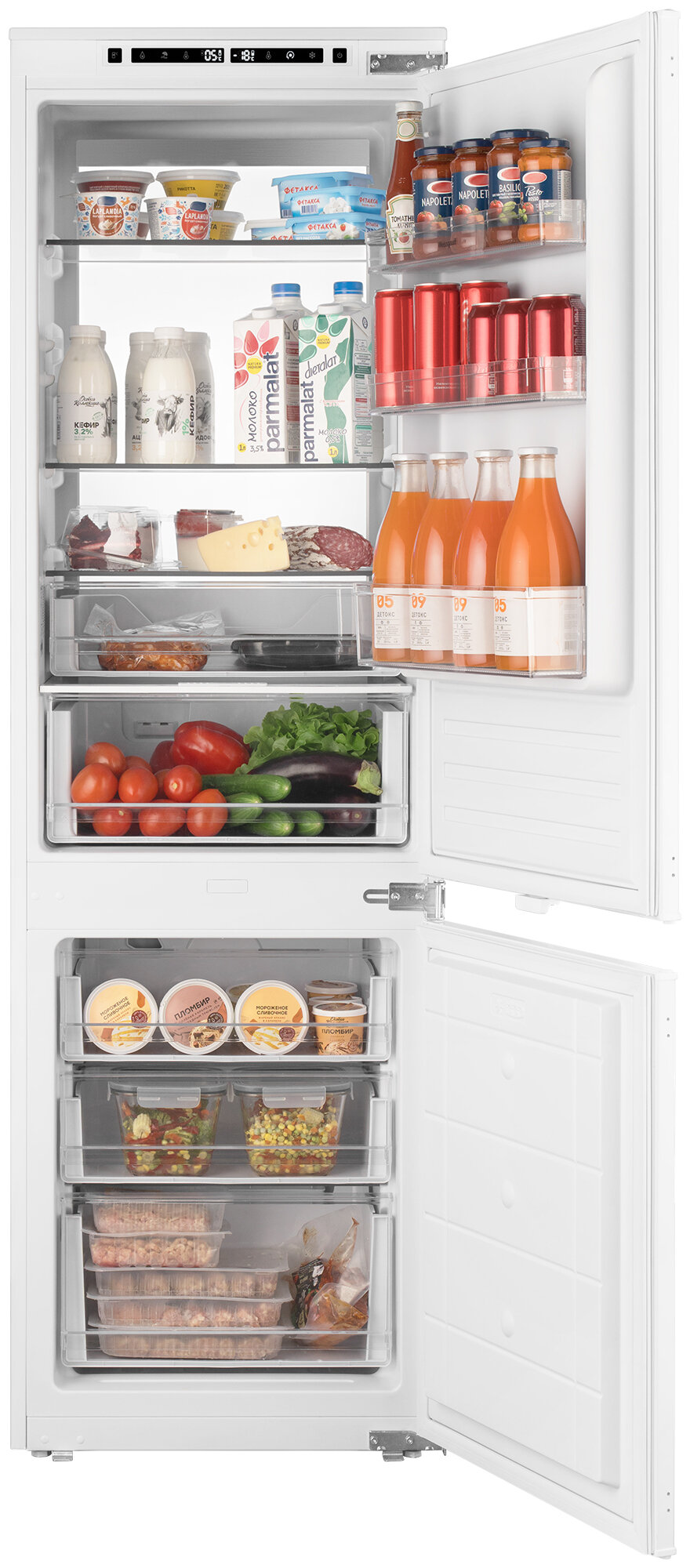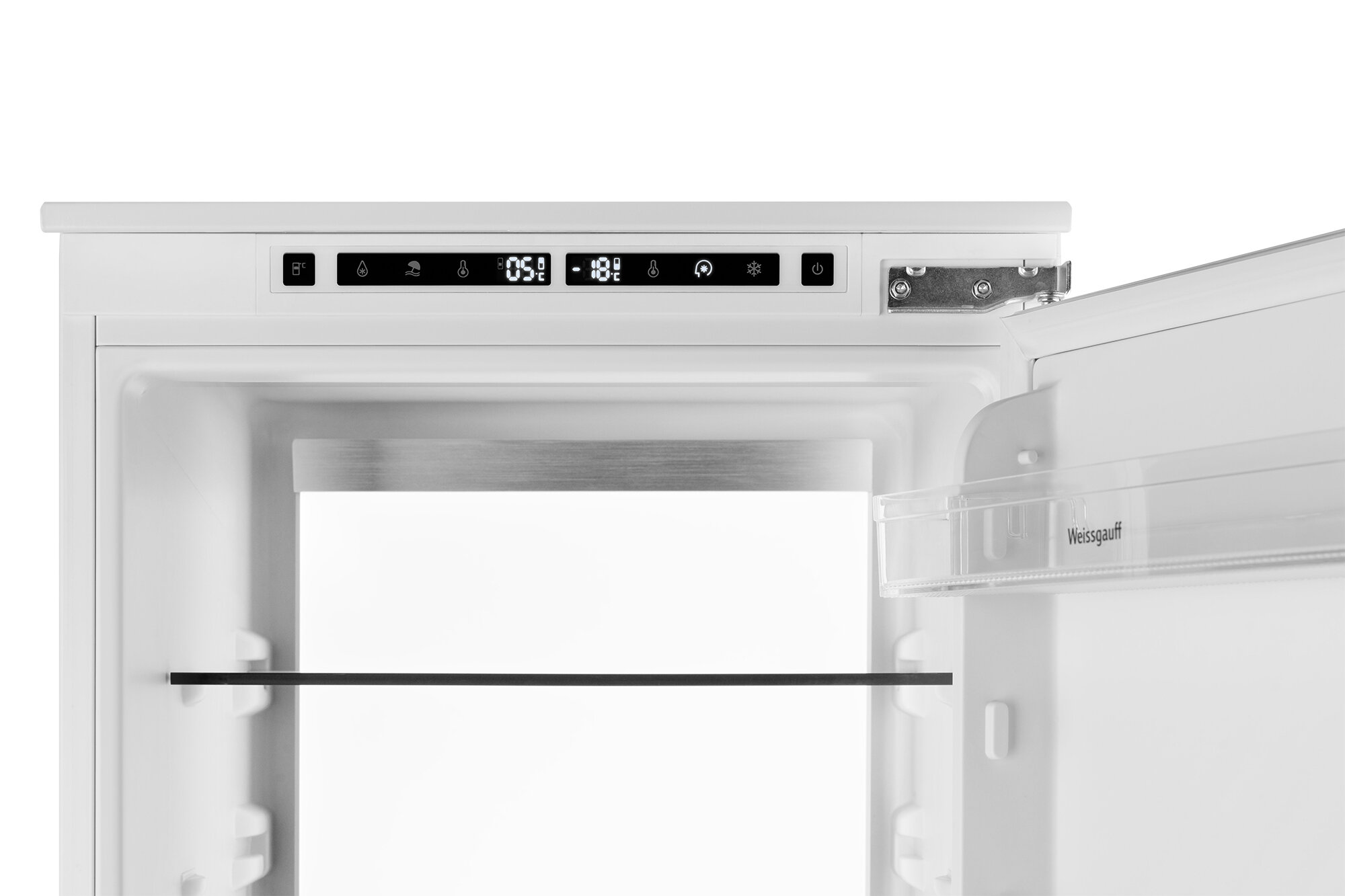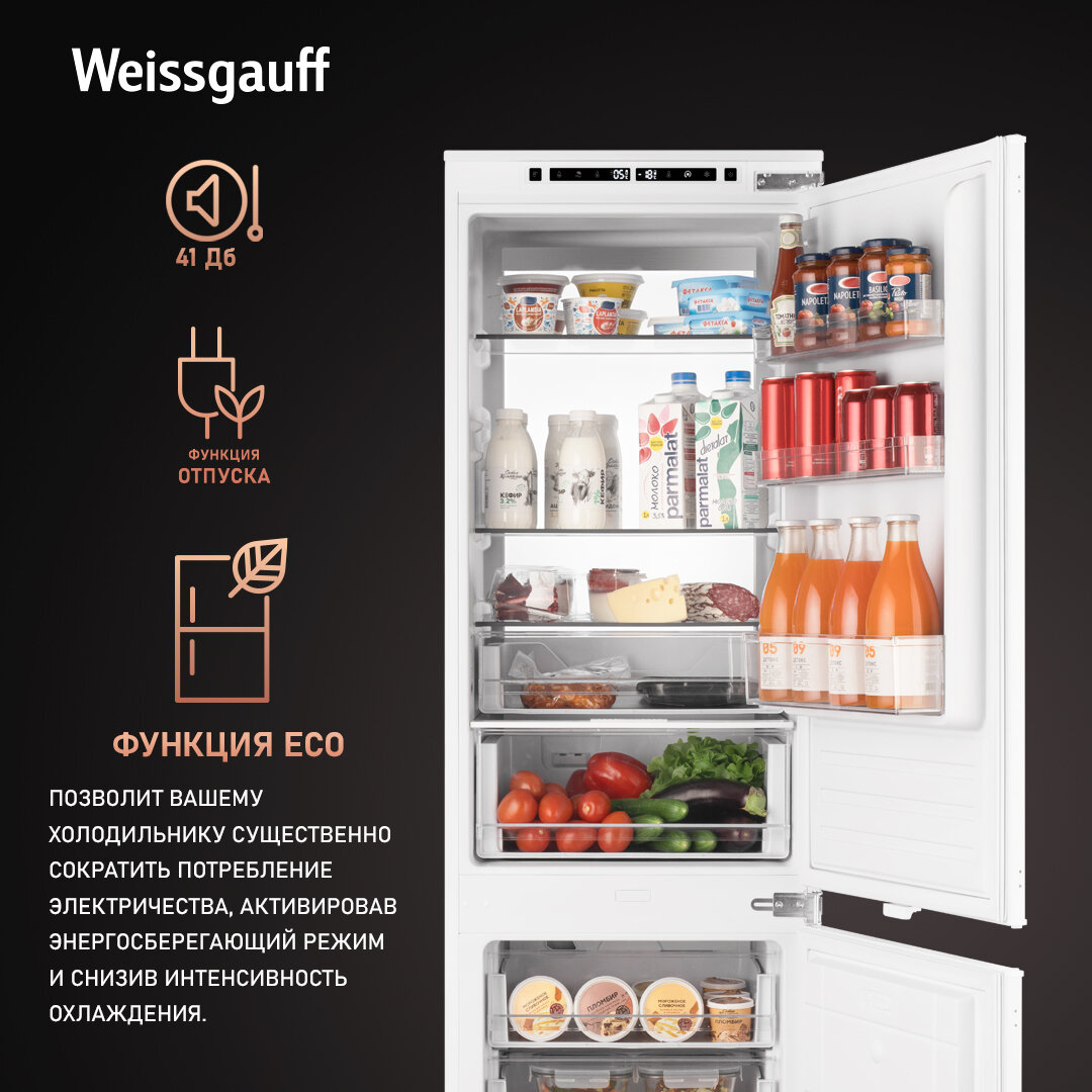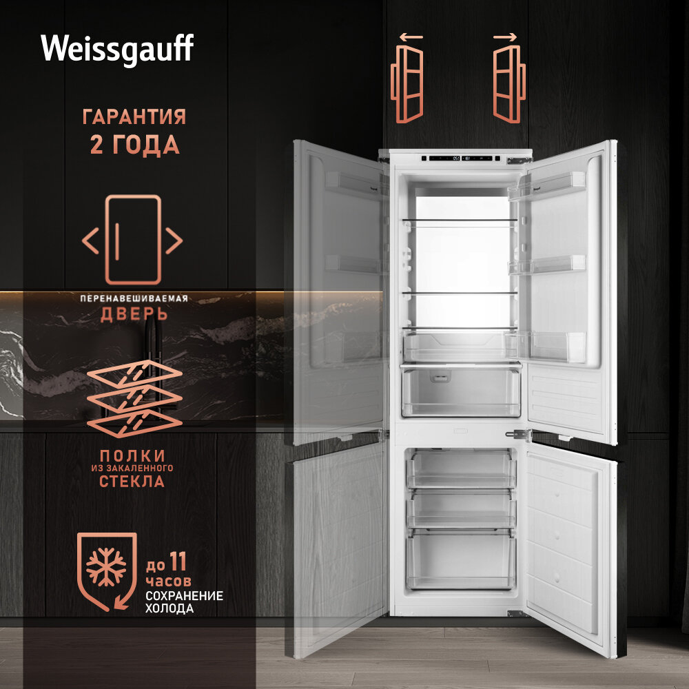 Встраиваемый холодильник с инвертором Weissgauff Wrki 178 Total NoFrost Premium Ecofresh двухкамерный, 3 года гарантии, высота 177 см, ширина 54 см, объем 237 л, зона свежести, суперзаморозка, суперохлаждение, электронное управление, LED-подсветка