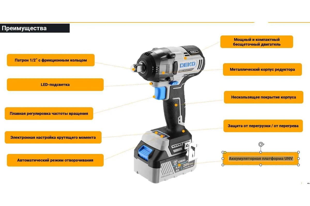 Купить DEKO Гайковерт аккумуляторный бесщеточный DKIS, 20В, 2х4.0Ач, 400Нм, в кейсе 063-4432