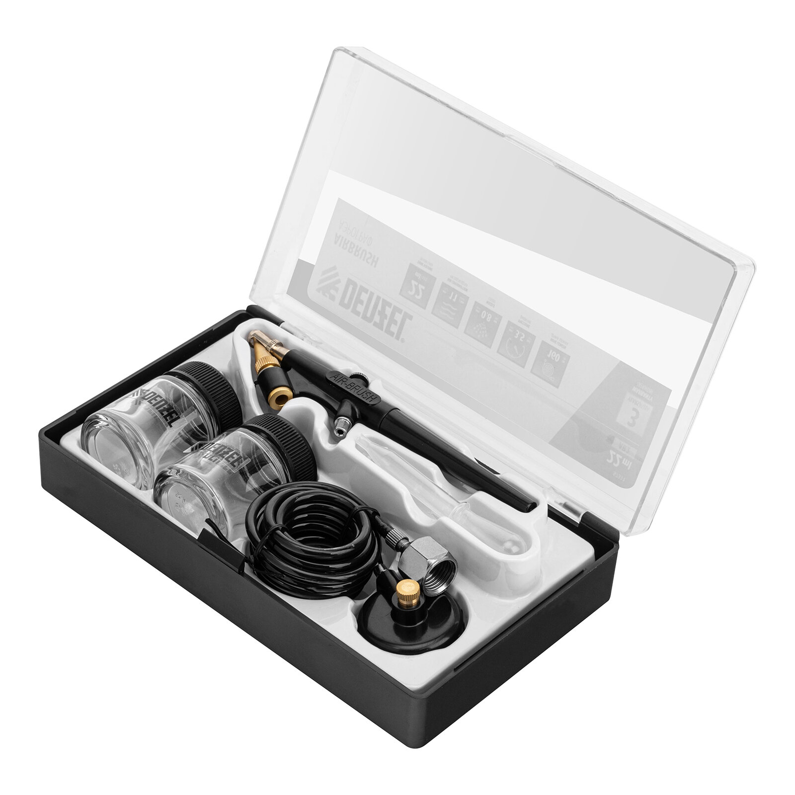 | Комплектация | дозатор - 1 шт., бачок - 2 шт., шланг для аэрографа - 1 шт., крышка-переходник - 1 шт., кейс - 1 шт., руководство по эксплуатации и гарантийный талон - 1 шт. |