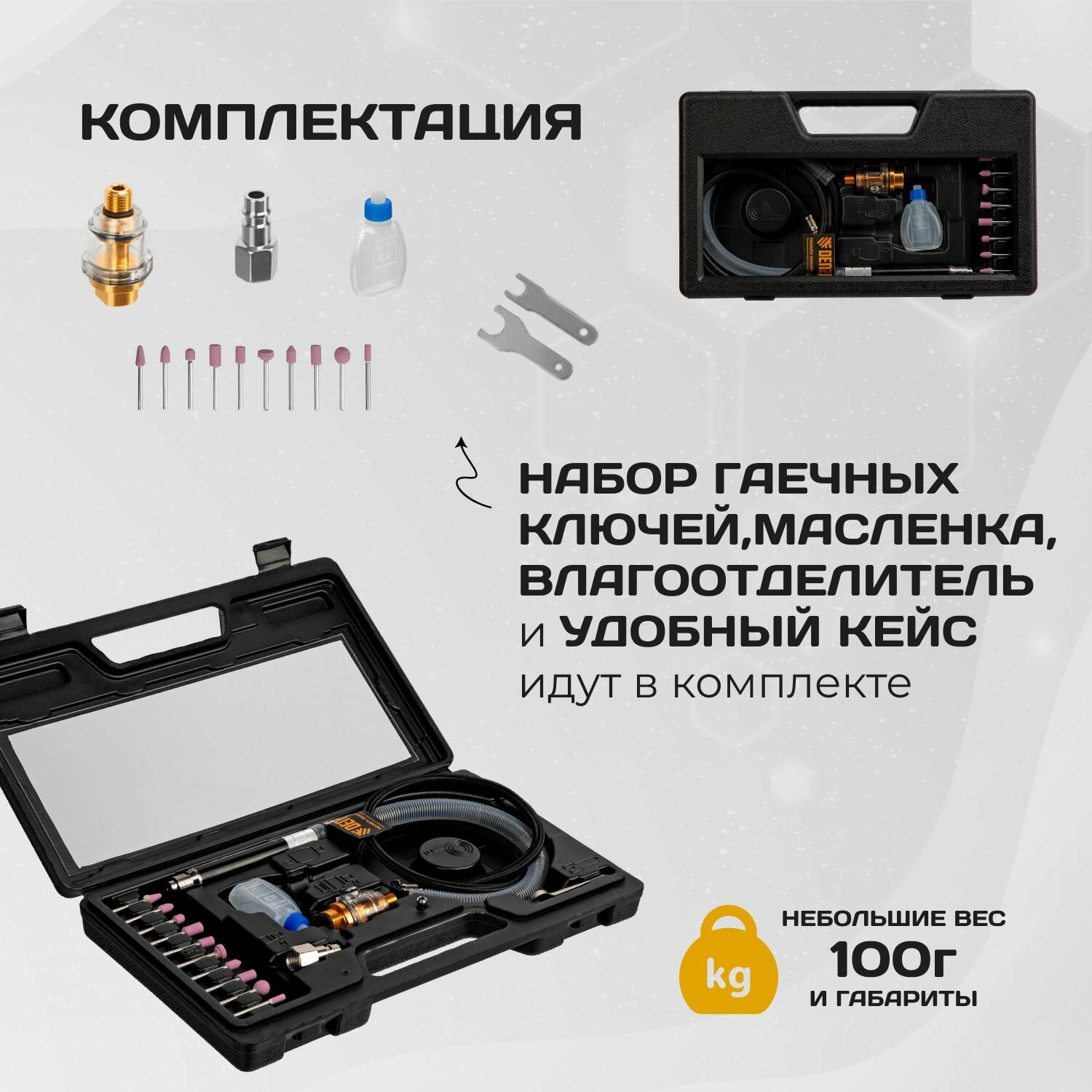 | Комплектация | пневмогравер, штуцер 1/4", шлифовальные камни - 10 шт, влагоотделитель, масленка, гаечный ключ - 2 шт., кейс, руководство по эксплуатации и гарантийный талон |