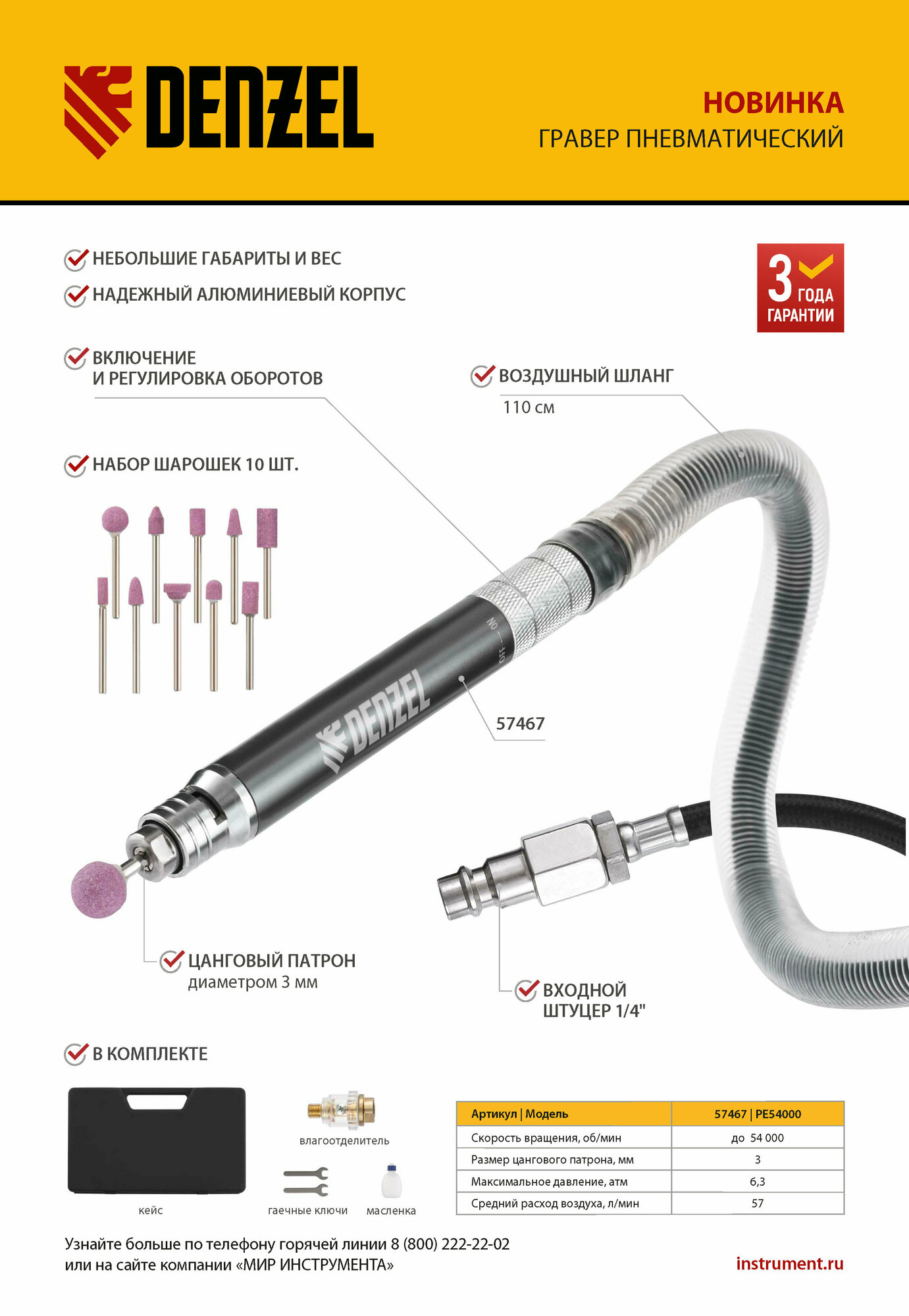 Пневматический гравер Denzel PE54000 57467, 54000 об/мин, 3 мм, 57 л/мин Denzel 10284106 .