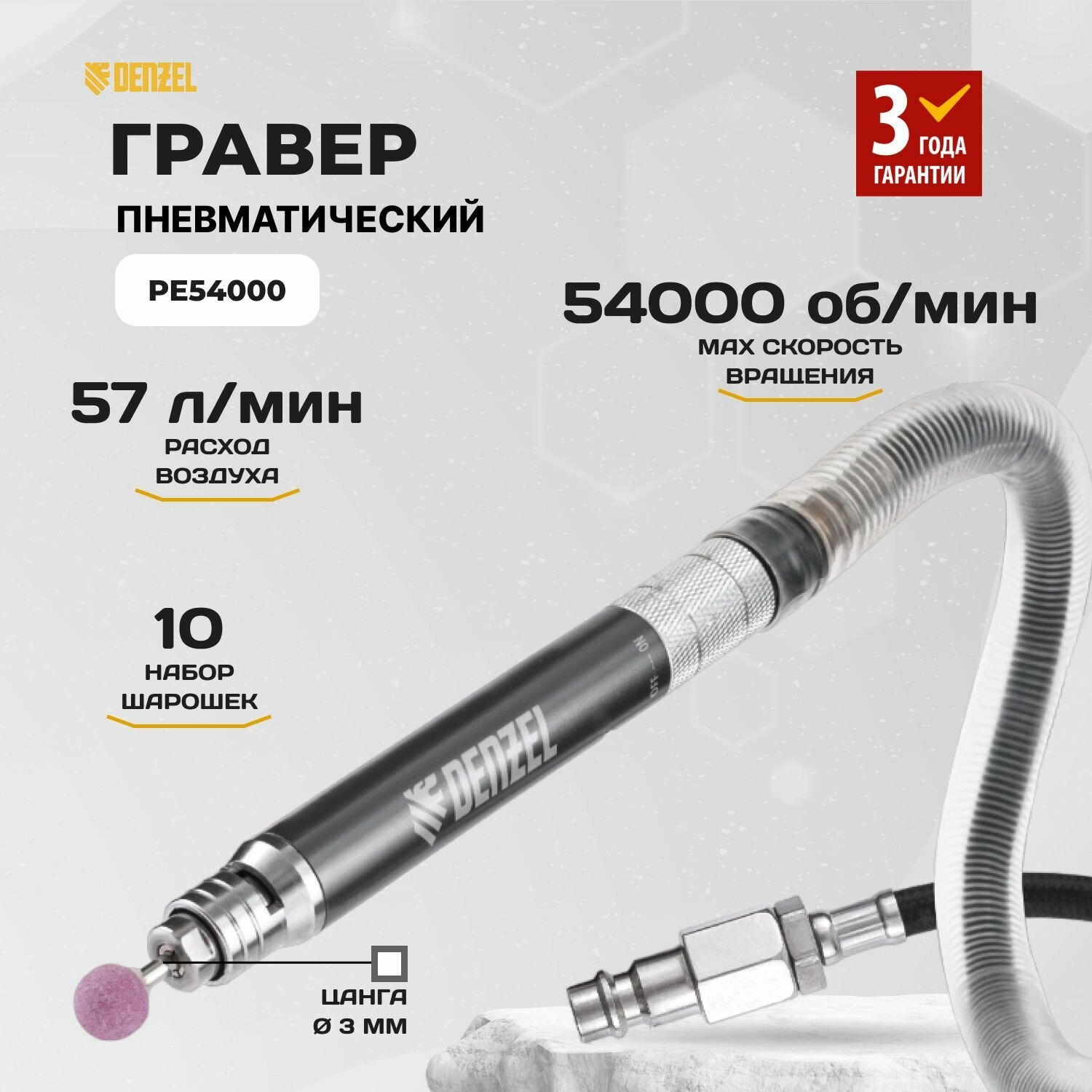 Пневматический гравер PE54000, 54000 об/мин, 3 мм, 57 л/мин Denzel