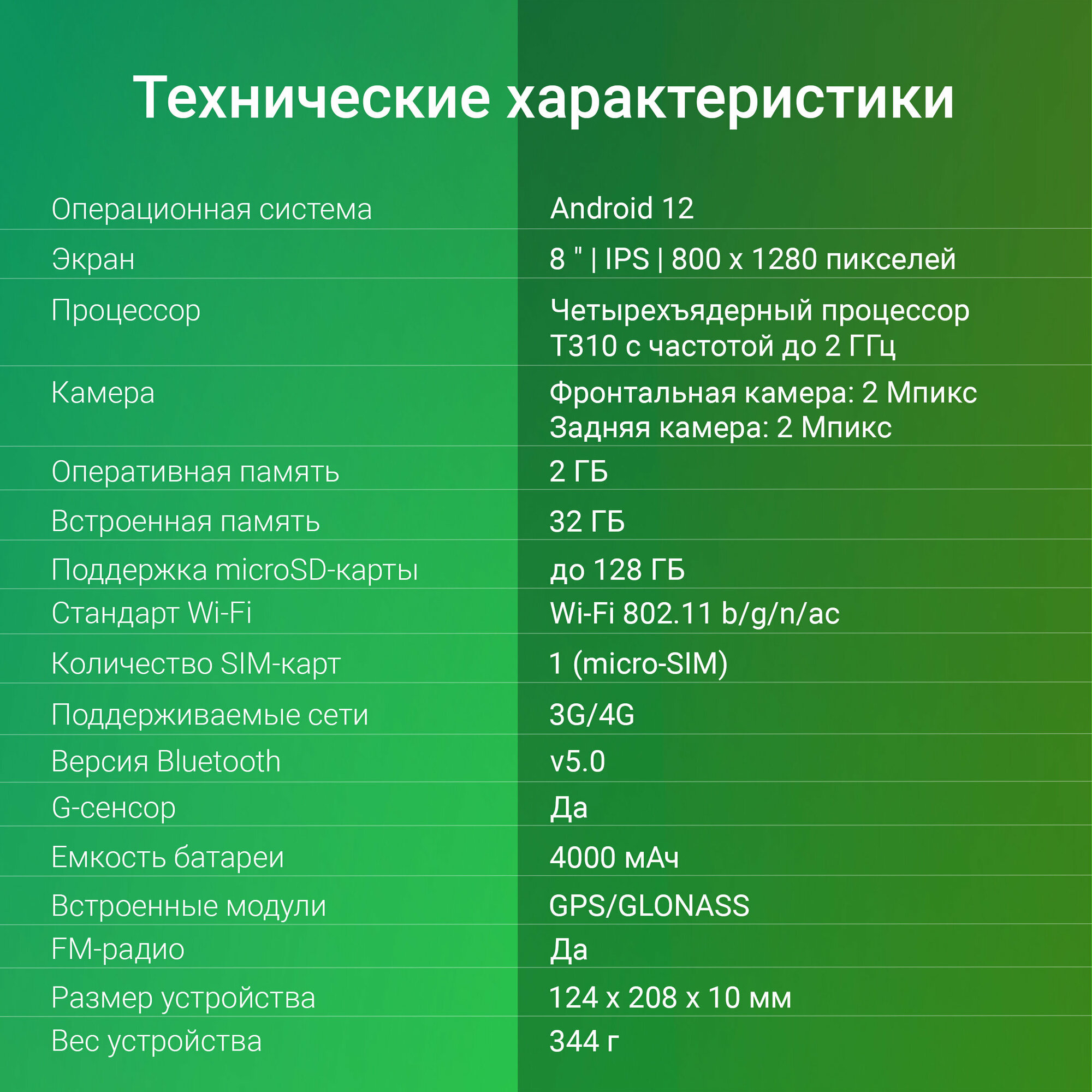 Планшет Digma Optima 8259C 4G T310 (1.8) 4C RAM2Gb ROM32Gb 8 IPS 1280x800 3G 4G Android 12 черный 2Mpix 2Mpix BT GPS WiFi Touch microSD 128Gb 4000mAh