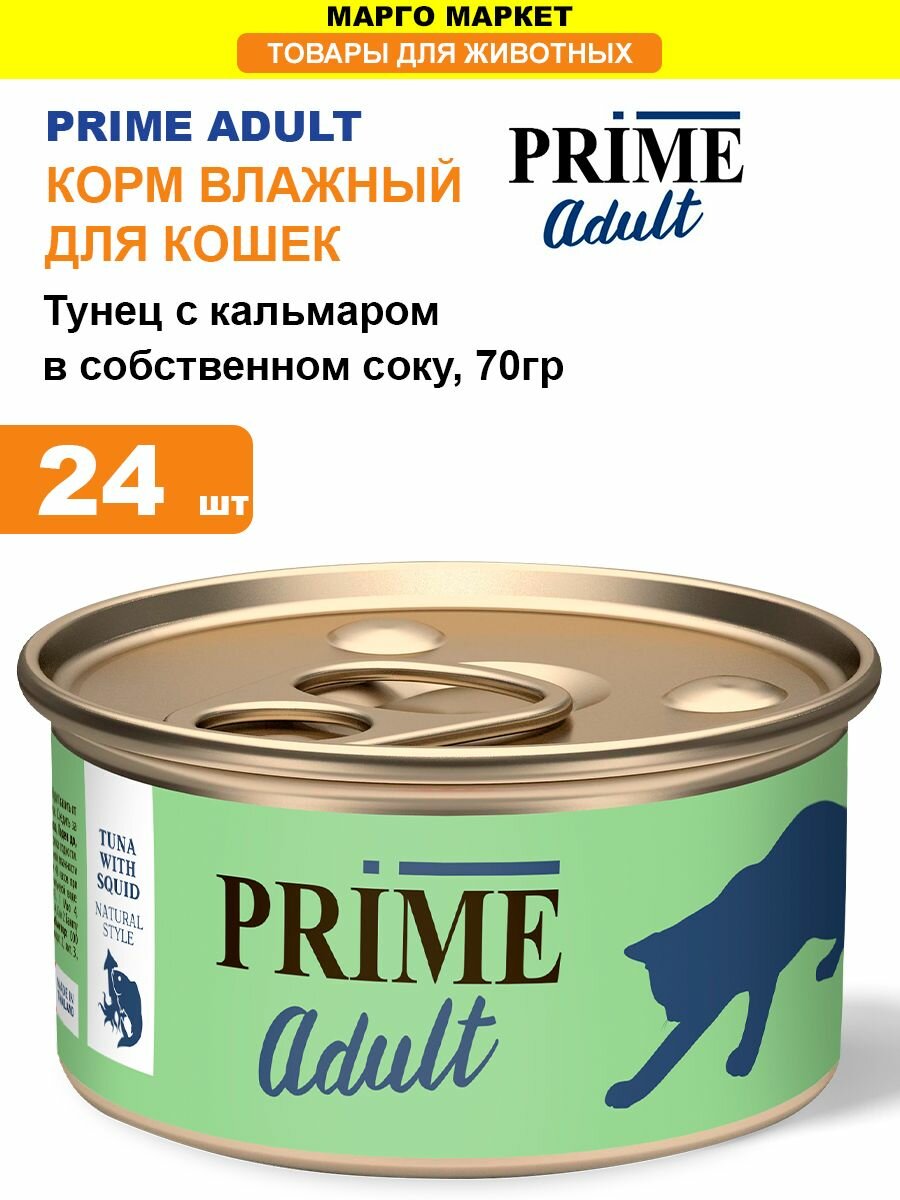 Купить PRIME ADULT CAT для взрослых кошек с тунцом и кальмаром в собственном соку (70 гр х 24 шт)