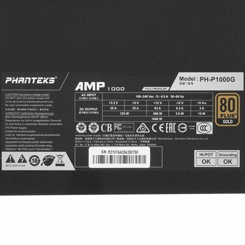 Блок питания 1000W Phanteks AMP Black (PH-P1000G_BK02) интересное: