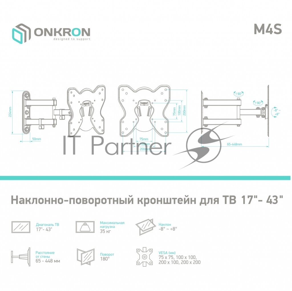 Кронштейн настенный ONKRON BASIC M4S 17-42'' макс. 200*200мм, 2 колена, наклон -+ 8º, поворот 180°, от стены 65-448мм, макс. вес 35кг, черный