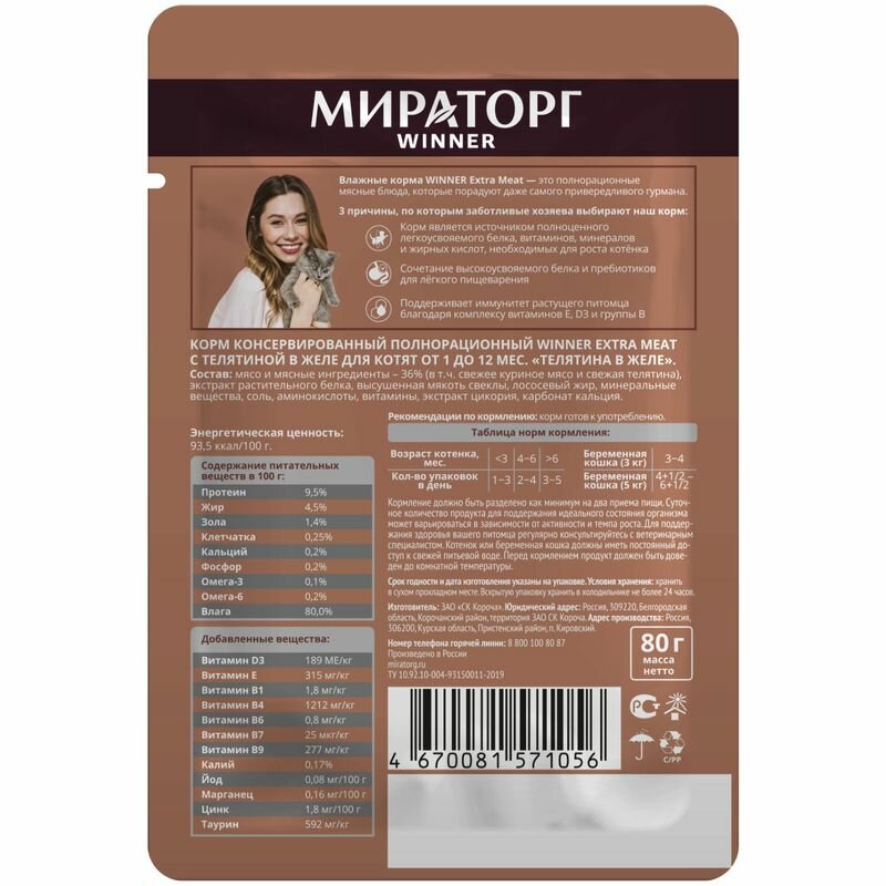 Корм консервированный для котят WINNER Extra Meat Телятина в желе, 80г интересное: