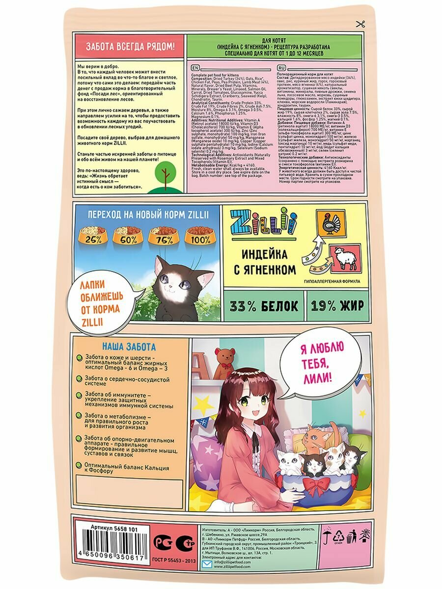 Корм сухой для котят 400 г, гипоаллергенный ZILLII (Зилли) Kitten, Индейка с Ягнёнком