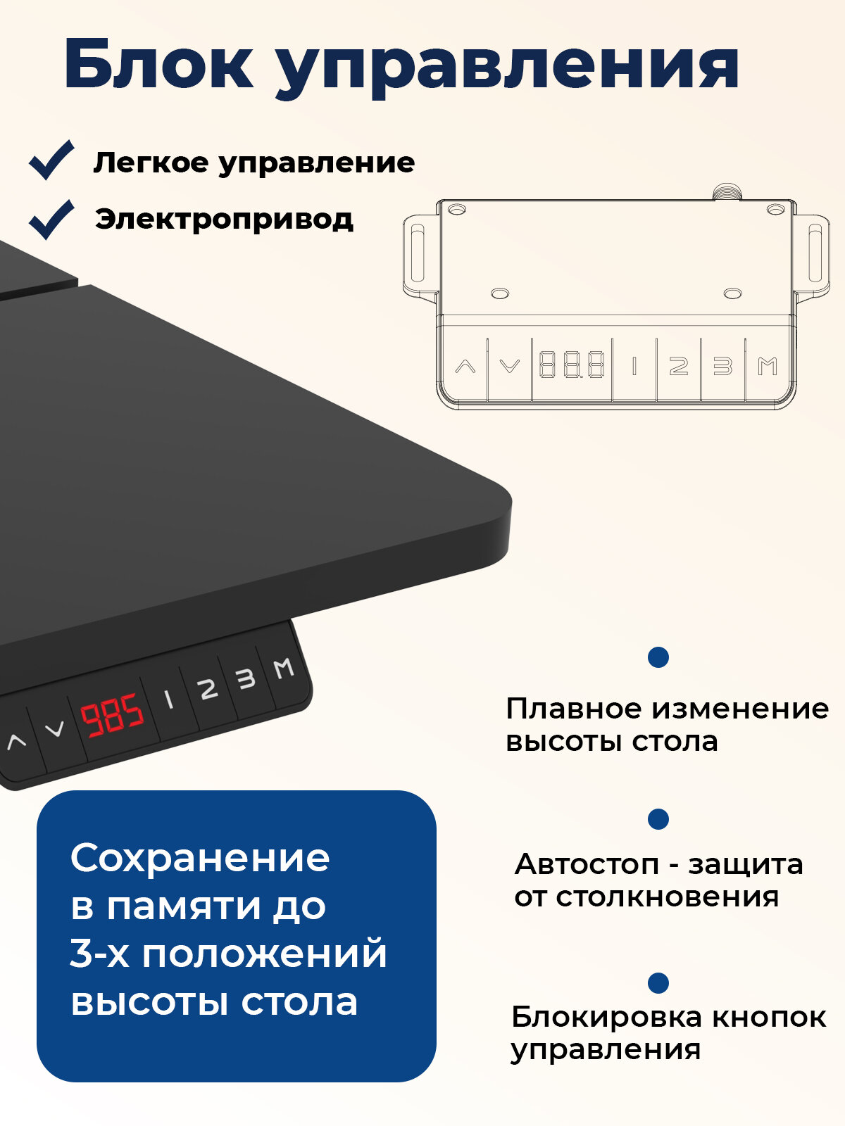 | Плюсы: | Плавный ход столешницы, есть возможность запоминания положения стола, современный дизайн |