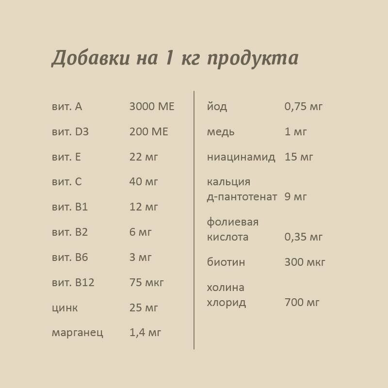 | Витамины | Витамин А — 3000 МЕ, витамин D3 — 200 МЕ, витамин E — 22 мг, витамин С — 40 мг, витамин В1 — 12 мг, витамин В2 — 6 мг, витамин В6 — 3 мг, витамин В12 — 75 мкг, ниацинамид — 15 мг, кальция д-пантотенат — 9 мг, фолиевая кислота — 0,35 мг, биотин — 300 мкг, холина хлорид — 700 мг, цинк — 25 мг, марганец — 1,4 мг, йод — 0,75 мг, медь — 1 мг. |