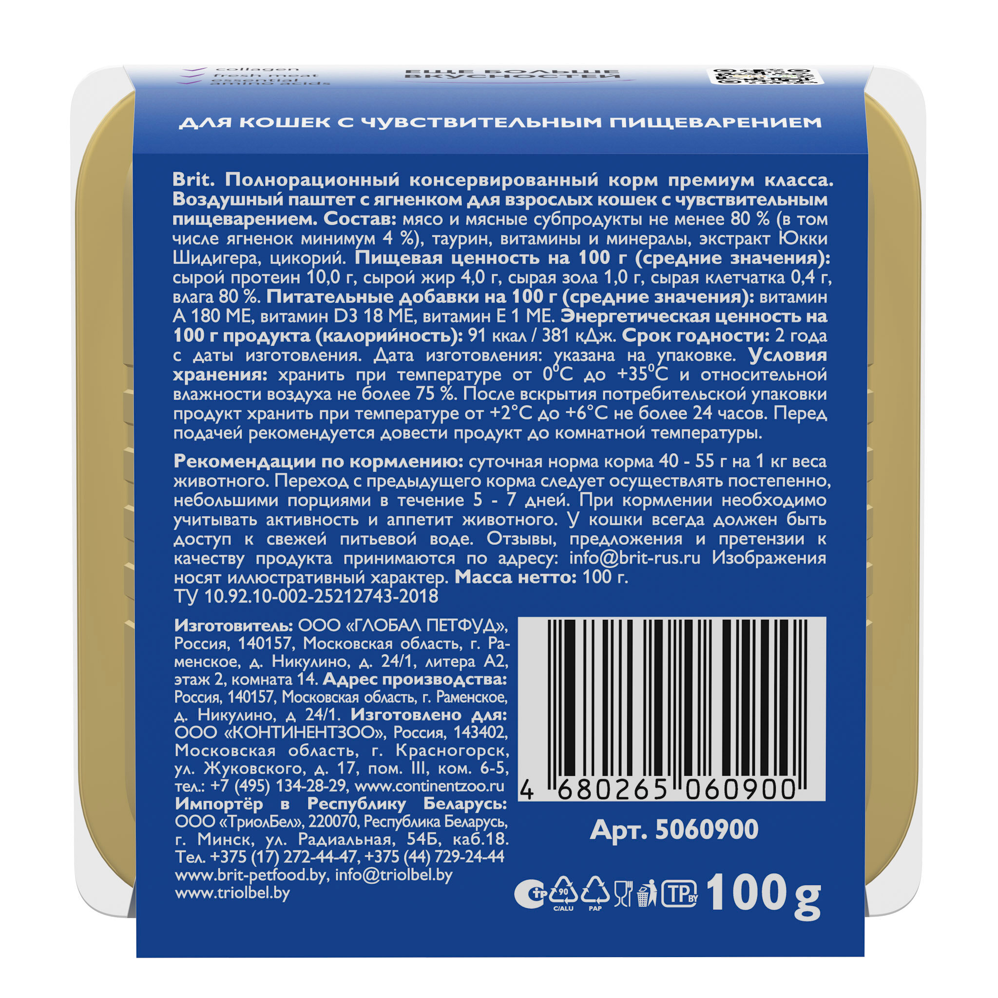 Brit: Premium, Воздушный паштет, для кошек с чувствительным пищеварением, Ягнёнок, 100 гр.