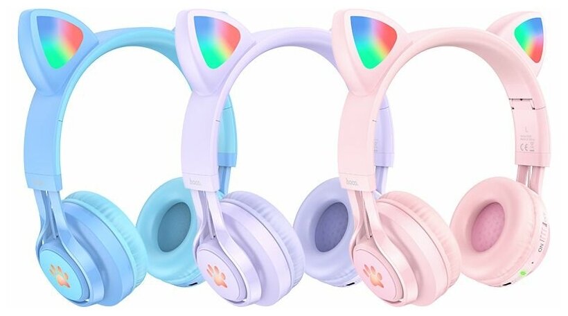 Bluetooth гарнитура Hoco W39 Cat Ear Kids, BT 5.3, AUX, 400мАч, накладные с ушками, подсветка, детские, синие интересное: