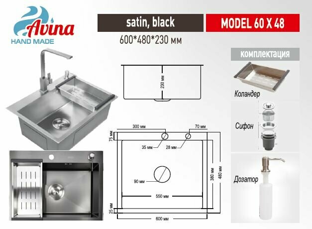 Кухонная мойка AVINA 60*48*23 см, 1 чаша, Black интересное: