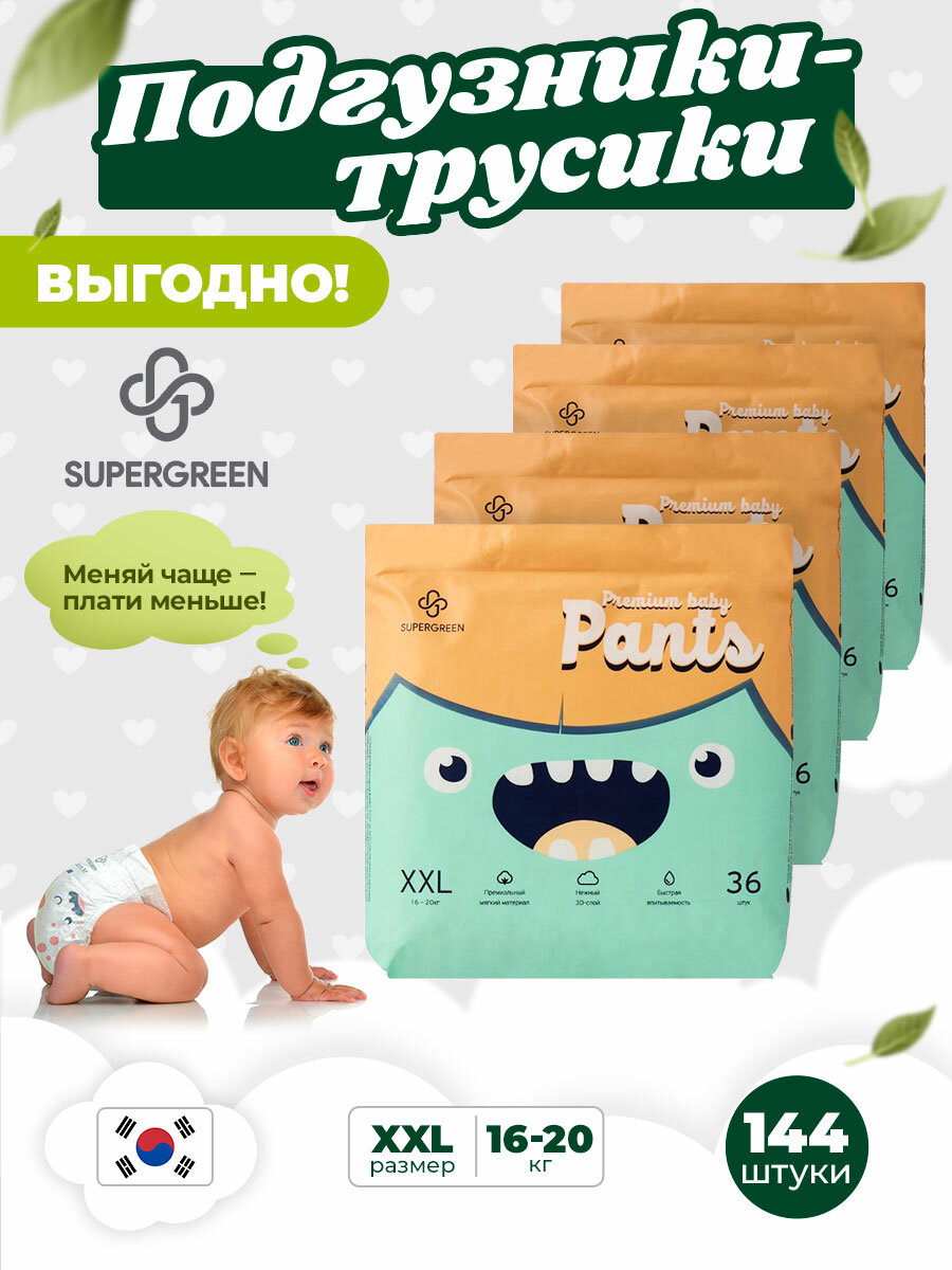 Подгузники-трусики Супергрин Premium XXL размер, 16-20 кг, 144 штук (4 упаковки по 36 шт), ультрамягкие интересное: