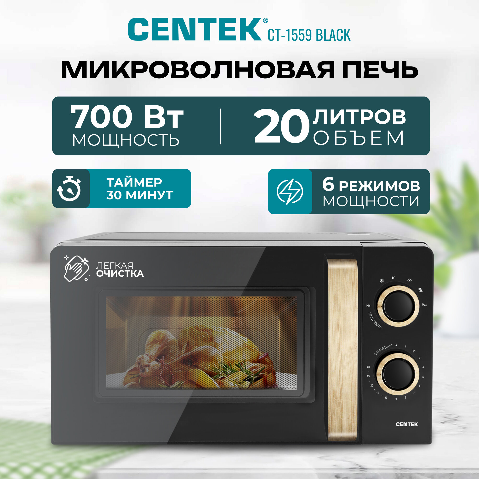 Микроволновая печь CENTEK CT-1559 Черный 700W, 20л, 6 уровней мощности, таймер, подсветка, открыван дверцы ручкой