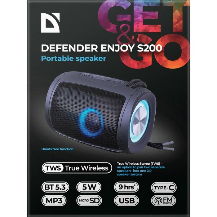 Колонка портативная Defender Enjoy S200, черный Моно, 5Вт, пластик с прорезиненным покрытием + металл, USB , USB Type-C