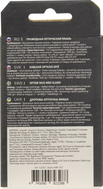 Мышь USB Defender Alpha MB-507 оптическая, 3D, бесшумная, кабель 1.8м, Black