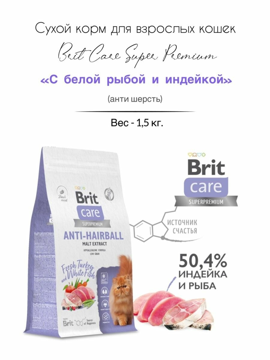 Сухой корм BRIT CARE Cat Anti-Hairball супер-премиум с белой рыбой и индейкой для взрослых кошек 1,5 кг