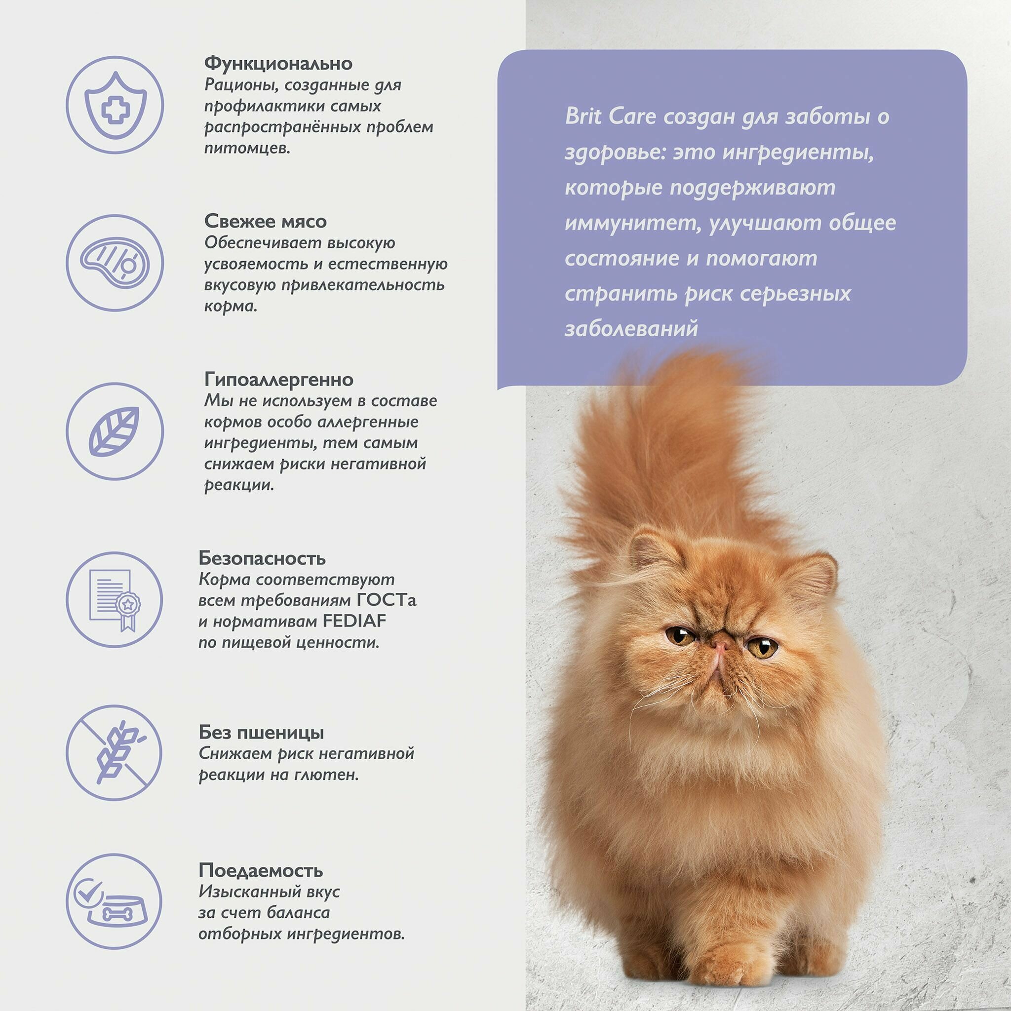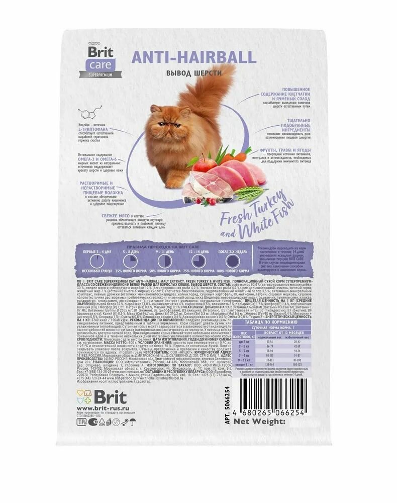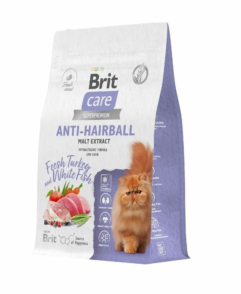 Купить BRIT CARE CAT ANTI-HAIRBALL для взрослых кошек для вывода шерсти с белой рыбой и индейкой (1,5 кг)