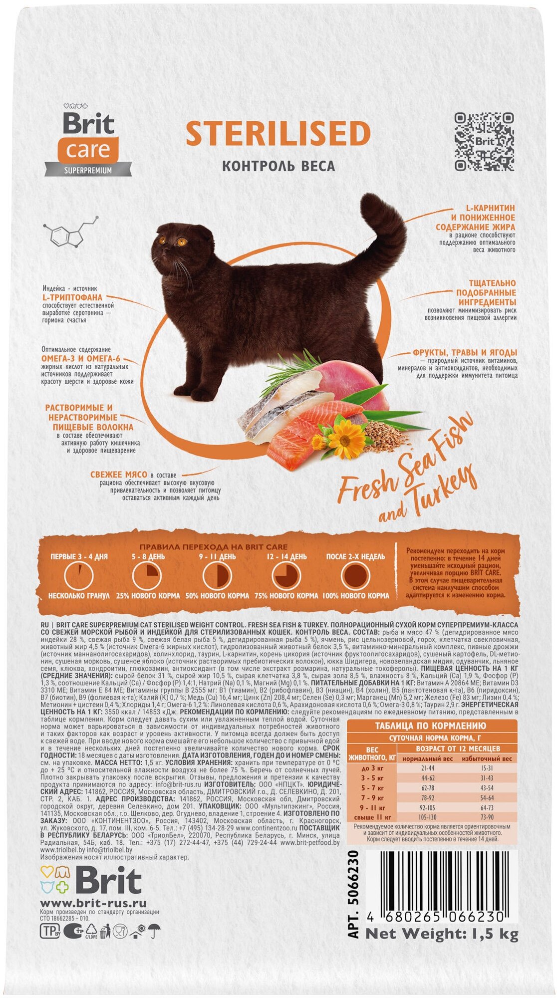 Сухой корм для стерилизованных кошек Brit Care Cat Sterilised Weight Control , контроль веса, с морской рыбой и индейкой 1,5 кг