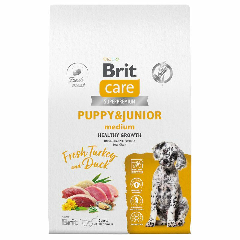 Купить Сухой корм BRIT CARE супер-премиум с индейкой и уткой для щенков средних пород "Dog Puppy&Junior M Healthy Growth" 3 кг
