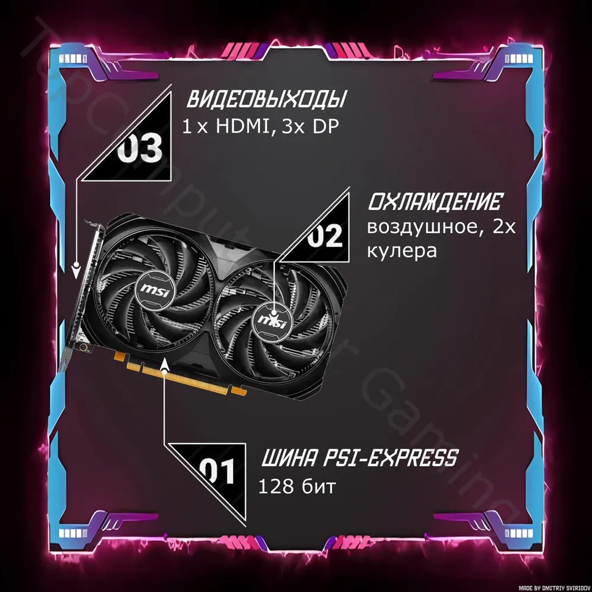 | Отзыв: | Пришло все целое, коробка, документы. Питание 8пин. На мой взгляд это сейчас лучшее решение на рынке видеокарт, производительность на уровне 3060ti, а с длсс 3.0 сильно впереди. Покупал без малого за 34к, за эти деньги самое лучший выбор, дороже не стоит покупать. Не парьтесь по поводу урезоной шины в 128бит, посмотрите сравнения в инете по этому поводу, там разница в 5-10% от нормальной шины ) |