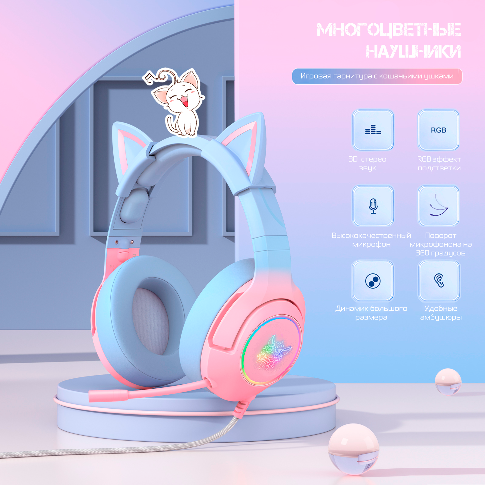 Игровые проводные наушники ONIKUMA K9 с RGB подсветкой и съемными ушками, Голубые с розовым
