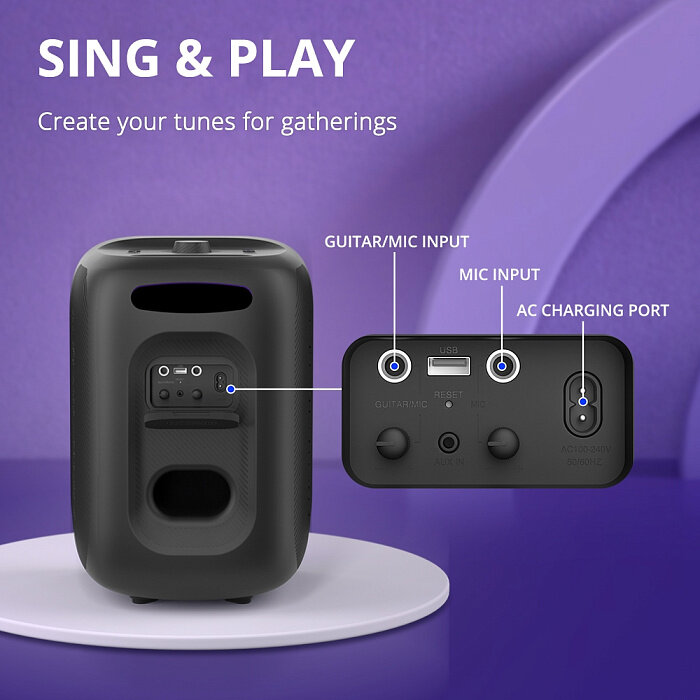 | Особенности | влагозащищенный корпус / встроенный микрофон (функция HandsFree) / караоке / поддержка microSD / режим Power Bank / световые эффекты |