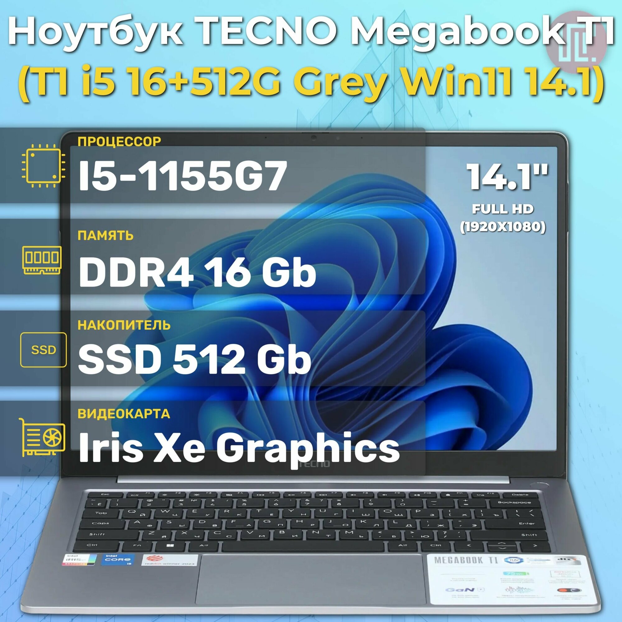 Ноутбук TECNO Megabook T1 i5-1155G7/16Gb/512Gb SSD/14,1" FHD IPS/Win 11 Grey