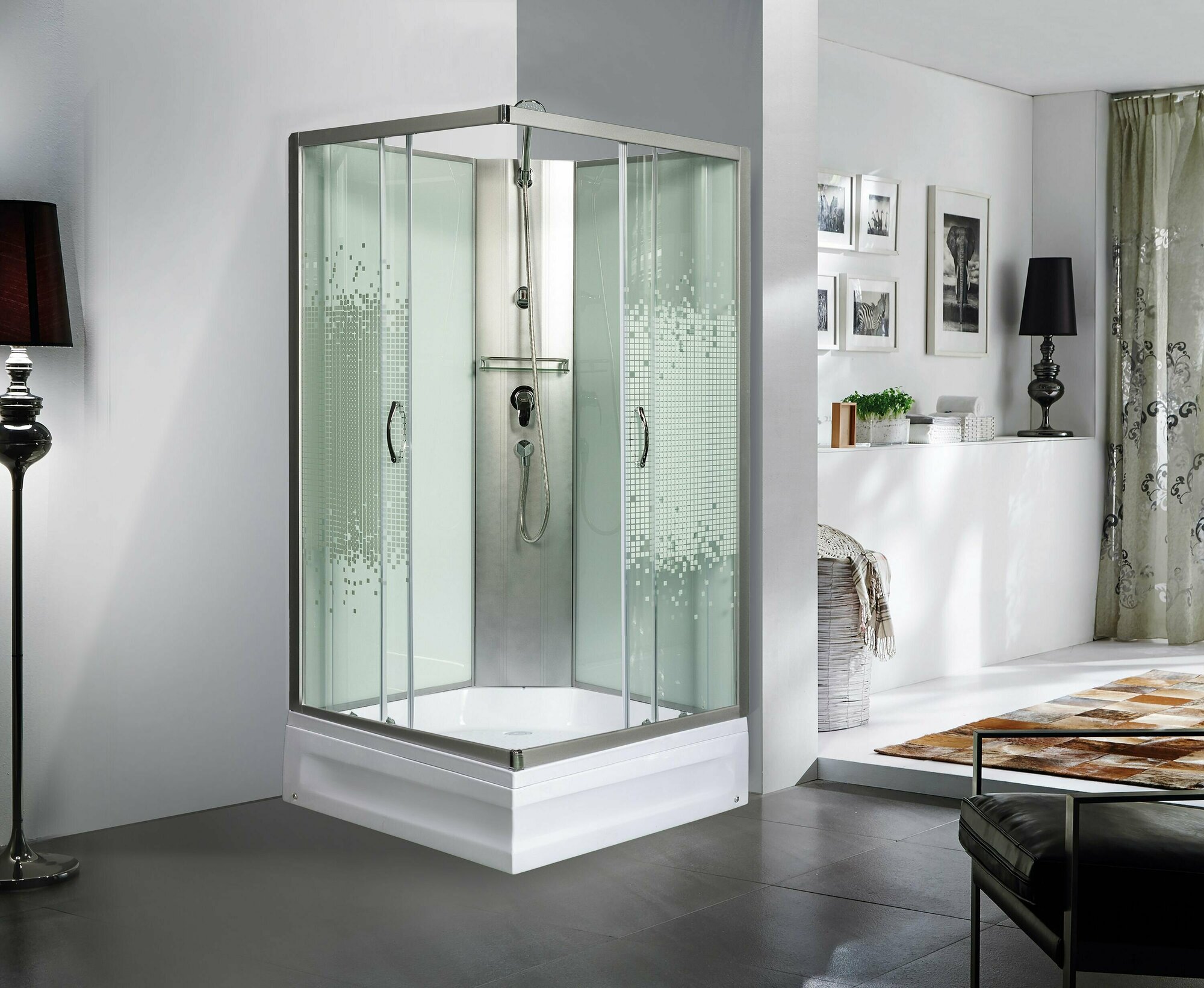 Душевые кабины Мономах 10000005802 без крыши , профиль хром , стекло прозрачное с рисунком мозаика