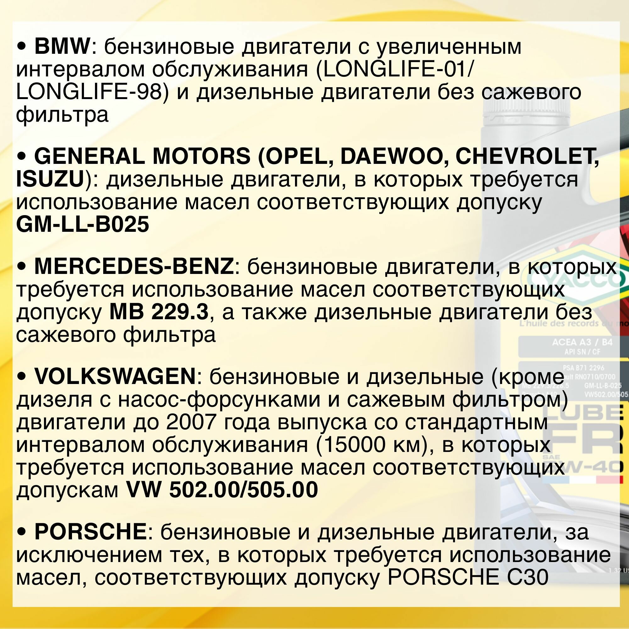 | Допуски OEM | BMW Longlife-01 / GM-LL-B-025 / MB 226.5 / MB 229.3 / PORSCHE A40 / PSA B71 2296 / Renault RN 0700 / Renault RN 0710 / VW 502.00/505.00 |