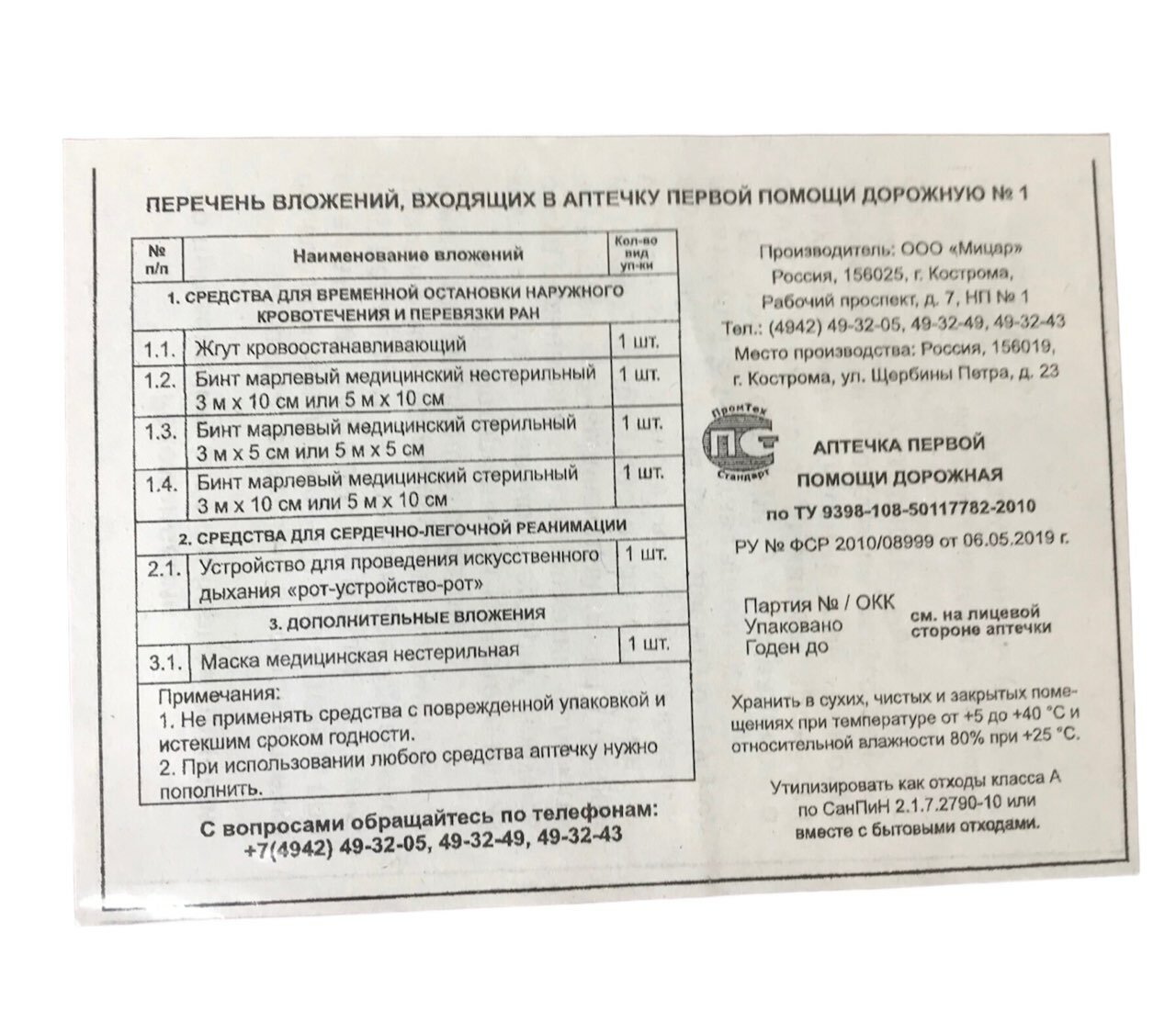 | Состав | 1. Средства для временной остановки наружного кровотечения и перевязки ран. 1.1. Жгут кровоостанавливающий 1 шт. 1.2. Бинт марлевый медицинский нестерильный 3 м*10 см или 5 м*10 см 1 шт. 1.3. Бинт марлевый медицинский стерильны 3 м*5 см или 5 м*5 см 1 шт. 1.4. Бинт марлевый медицинский стерильный 3 м*10 см или 5 м*10 см 1 шт. 2. Средства для сердечно-легочной реанимации. 2.1. Устройство для проведения искусственного дыхания "рот--устройство-рот" 1 шт. 3. Дополнительные вложения. 3.1. Маска медицинская нестерильная 1 шт. |