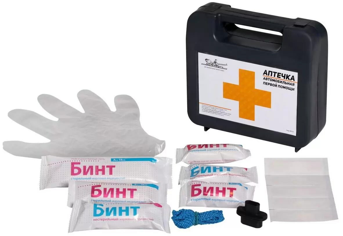 | Состав | бинт марлевый медицинский нестерильный 5м x 5см 1 шт, бинт марлевый медицинский нестерильный 5м x 10см - 1 шт, бинт марлевый медицинский стерильный 5м x 7см 1 шт, бинт марлевый медицинский стерильный 5м x 10см 1 шт, бинт марлевый медицинский стерильный 7м x 14см 1 шт, жгут кровоостанавливающий 1 шт, лейкопластырь бактерицидный не менее 1,9 см x 7,2см 5 шт, устройство для проведения искусственного дыхания “рот-устройство-рот” 1 шт, перчатки смотровые нестерильные 1 пара, футляр пластиковый |