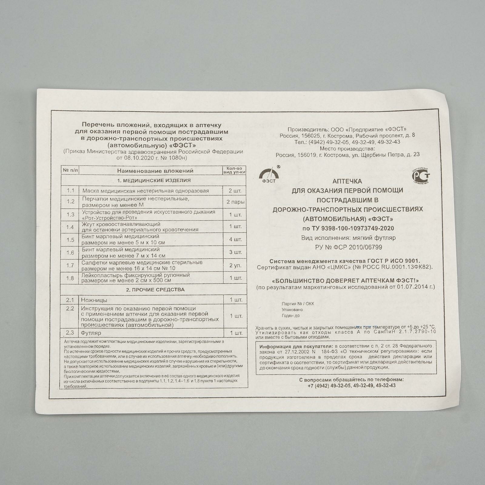 Аптечка автомобильная ФЭСТ футляр из полистирола, новый состав по приказу № 1080Н от 08.10.20