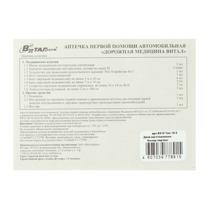 Виталфарм Аптечка первой помощи автомобильная витал, по приказу № 1080н, пластиковый футляр интересное: