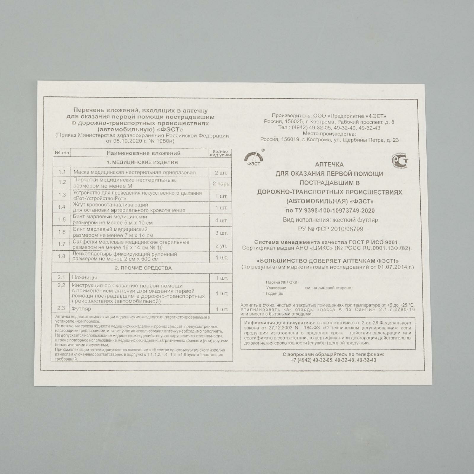 Аптечка автомобильная ФЭСТ футляр из полистирола, новый состав по приказу № 1080Н от 08.10.20