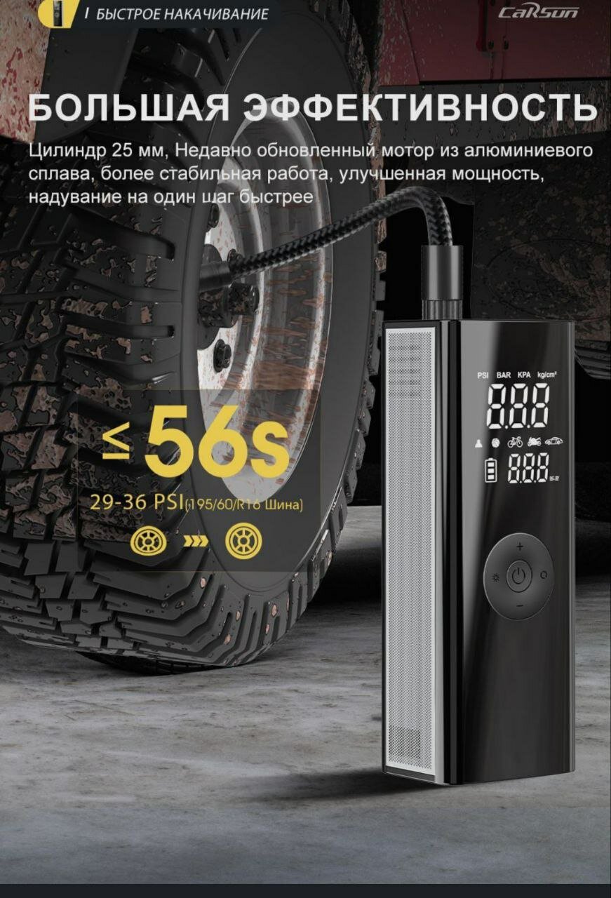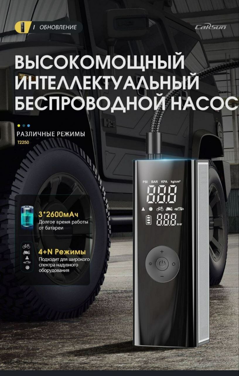 Портативный беспроводной компрессор CARSUN T2250, для автомобиля, мотоцикла, велосипеда, 4 насадки, с фонариком интересное: