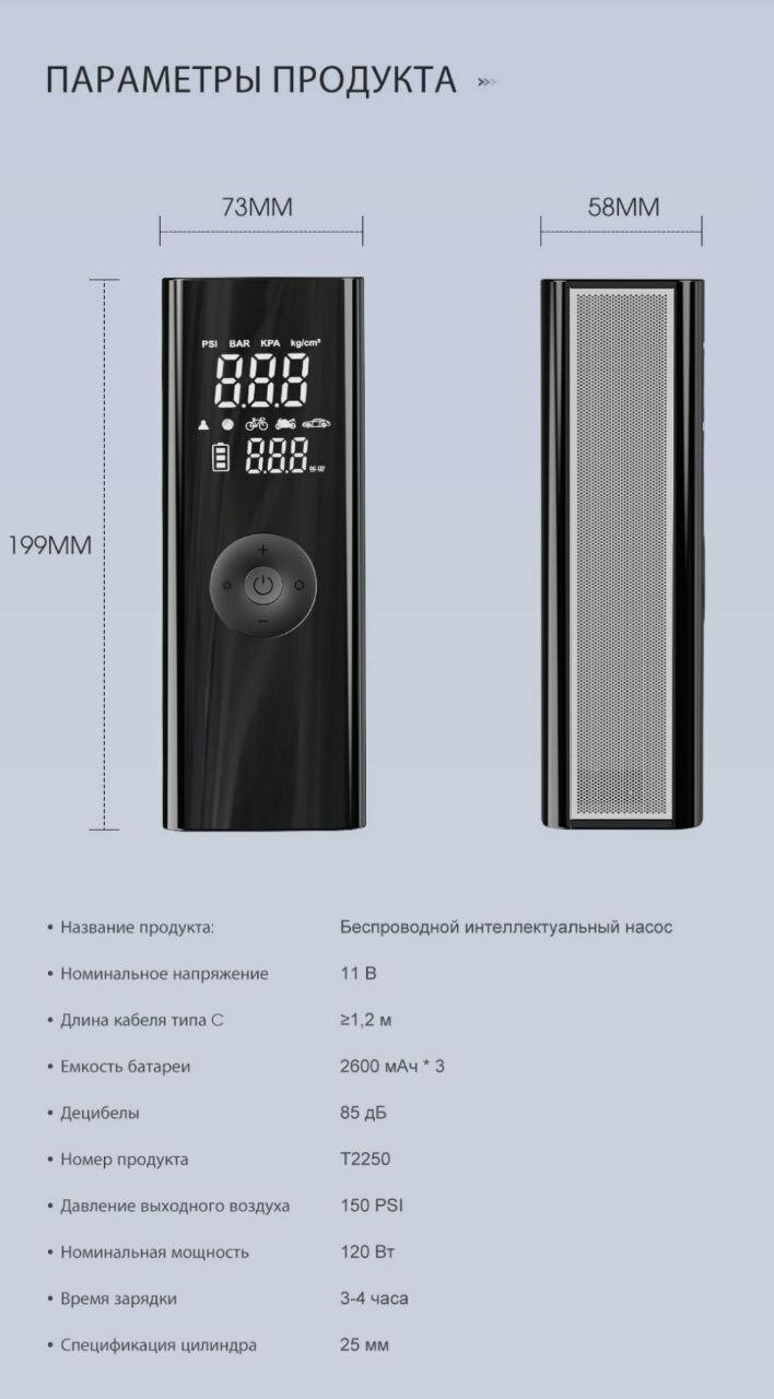| Подробная комплектация | цифровой компрессор, набор насадок, инструкция, кабель зарядки, шланг |