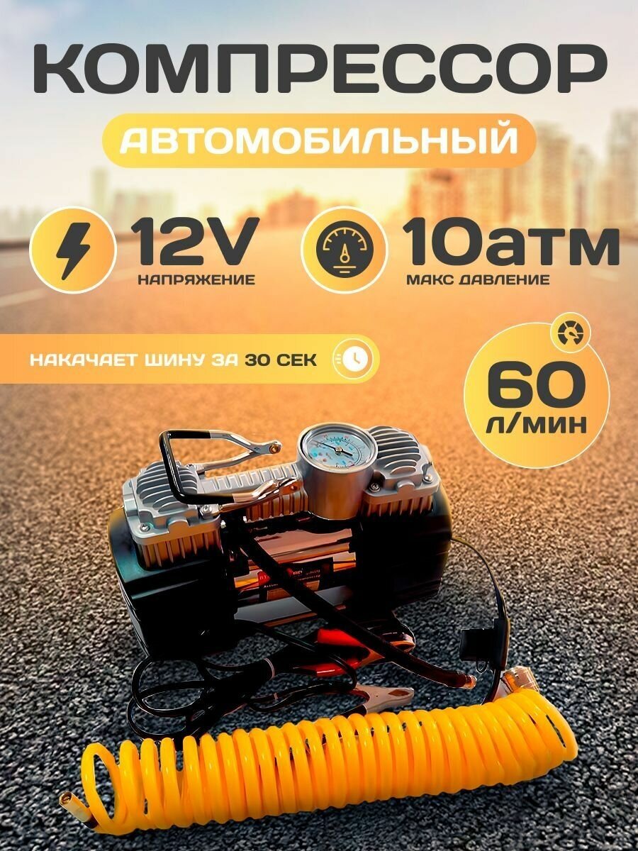Компрессор автомобильный CityUP двухпоршневой с фонарем, 60л/мин, 300 Ватт, сумка в комплекте + переходник для АКБ