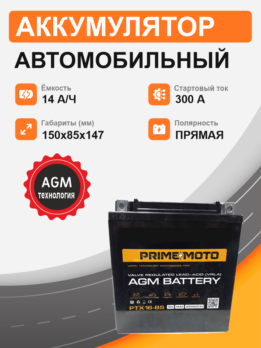 Аккумулятор PRIME MOTO CT 1214 14 Ач 300А П/П PTX14-BS интересное: