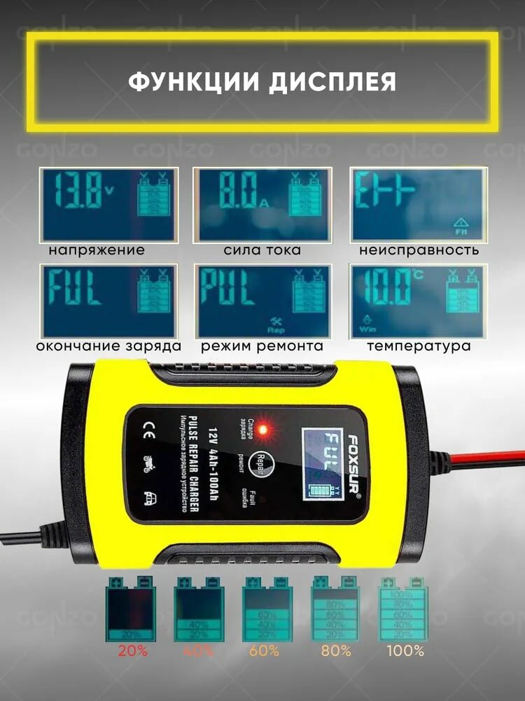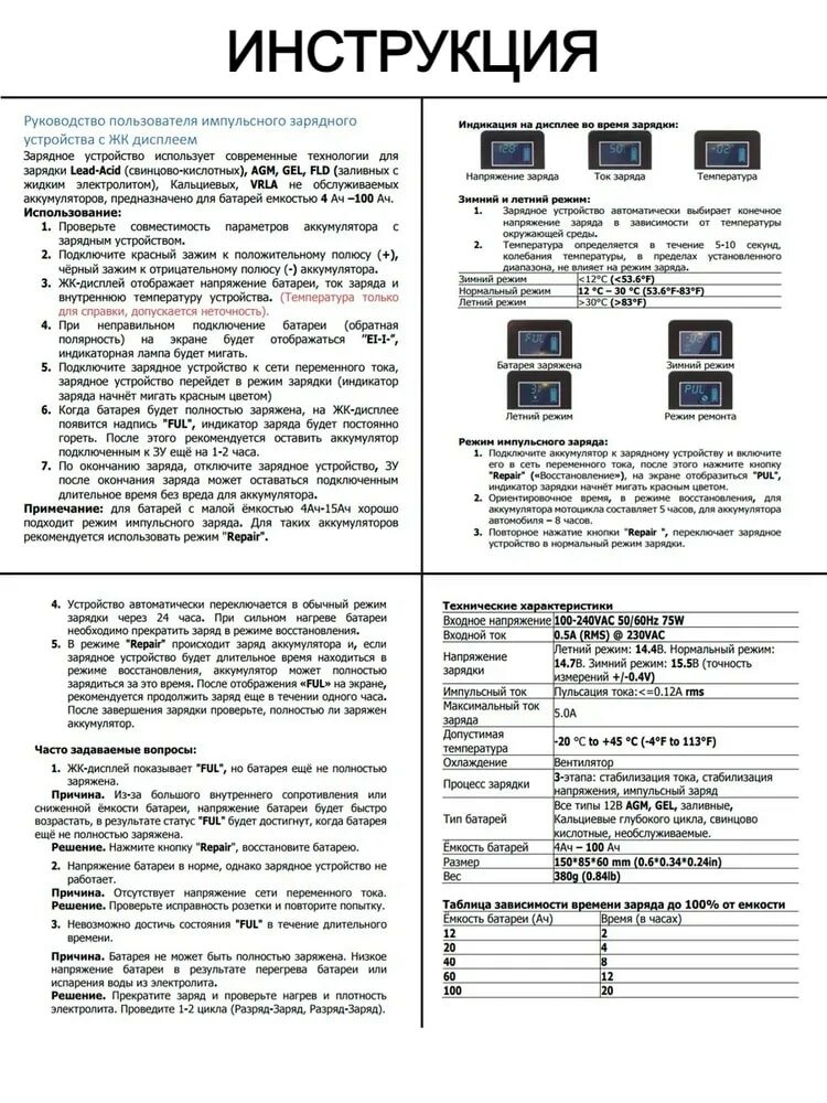 | Функции | зарядка мобильных устройств (Powerbank) / подходит для AGM/GEL аккумуляторов / режим зимней зарядки |