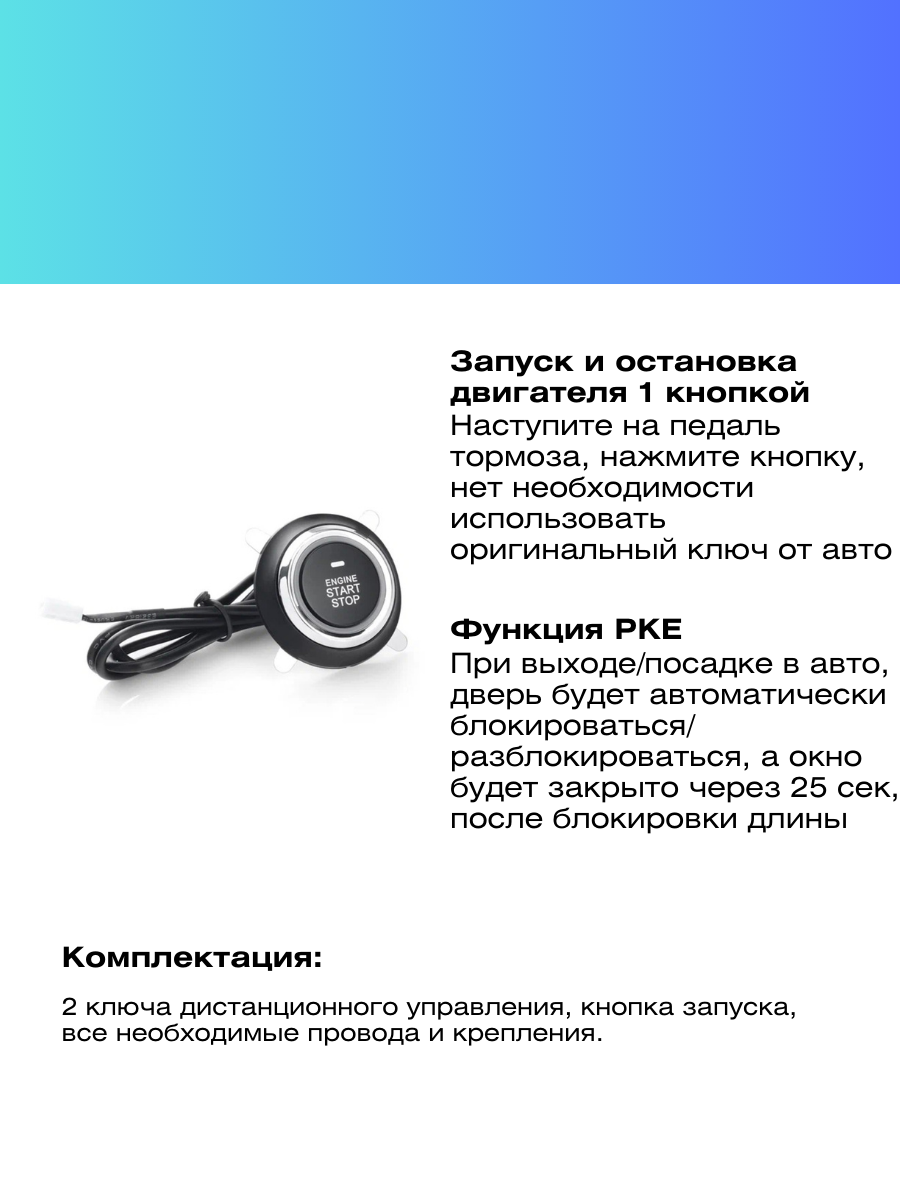 | Подробная комплектация | кнопка запуска двигателя, 2 брелка, все необходимые для подключения провода и крепления |