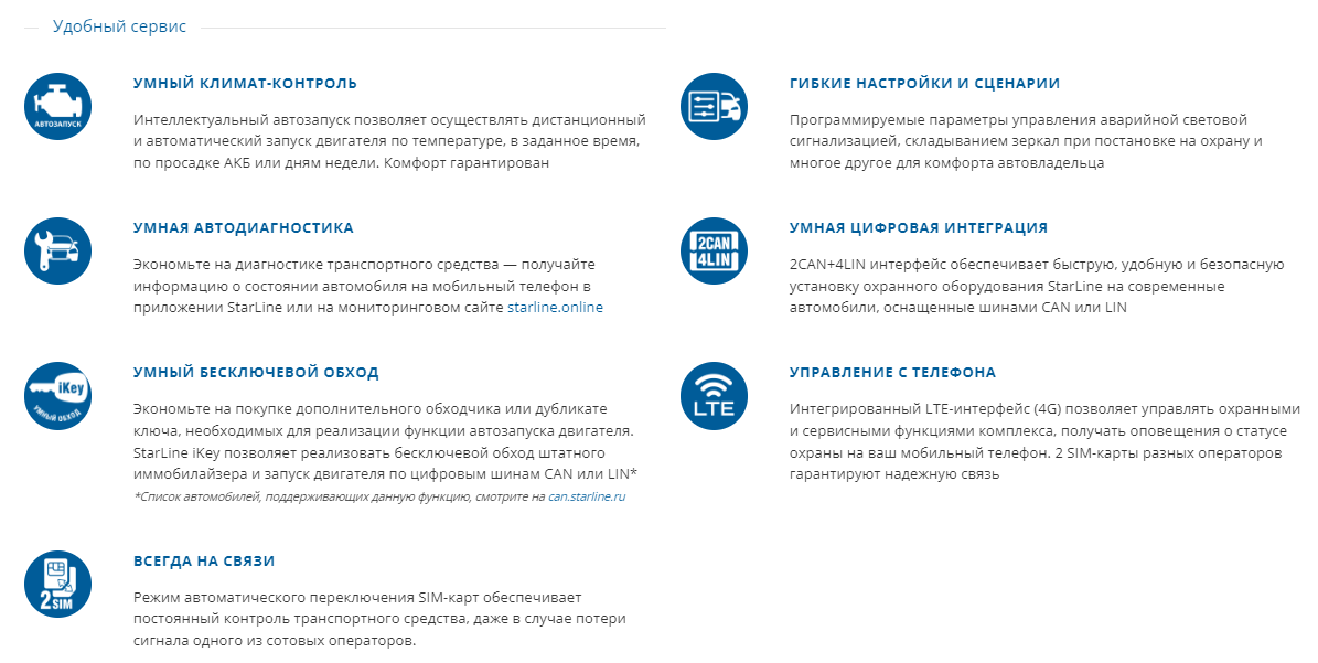 | Сервисные функции | автоблокировка дверей / автодоводчик стекол / дистанционный запуск двигателя / позонное отключение / поиск транспортного средства / программирование функций / турботаймер |