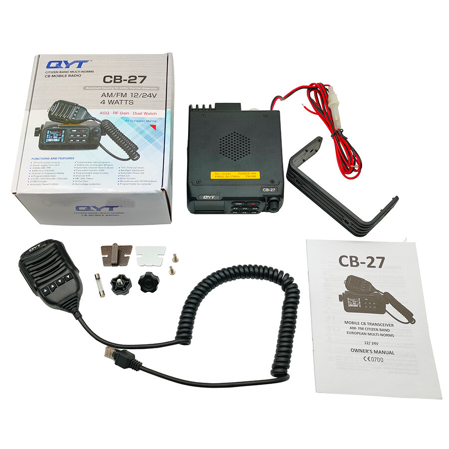 | Комплектация | Рация QYT CB-27 Тангента, автомобильный кабель питания, монтажный кронштейн, винты, руководство пользователя |